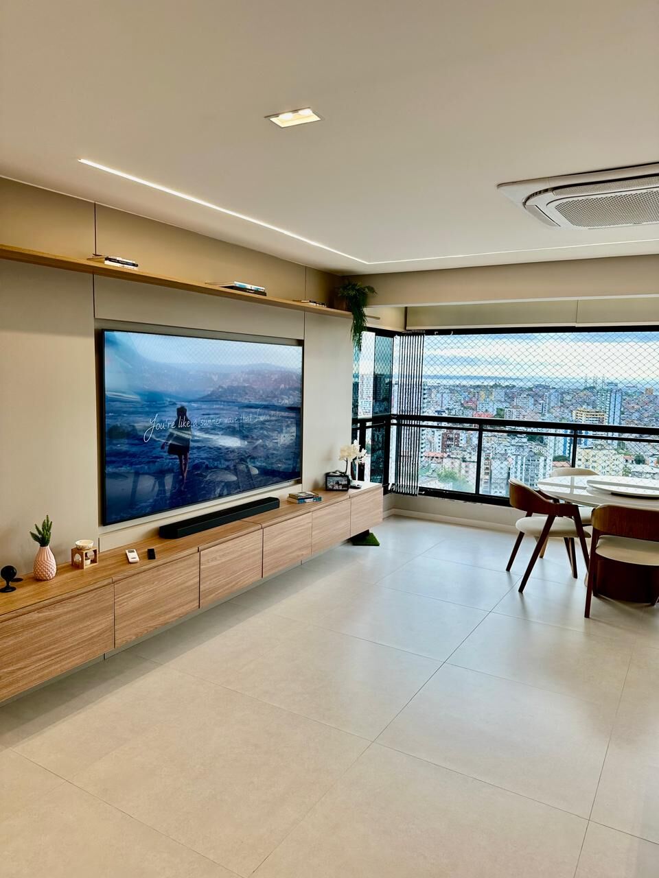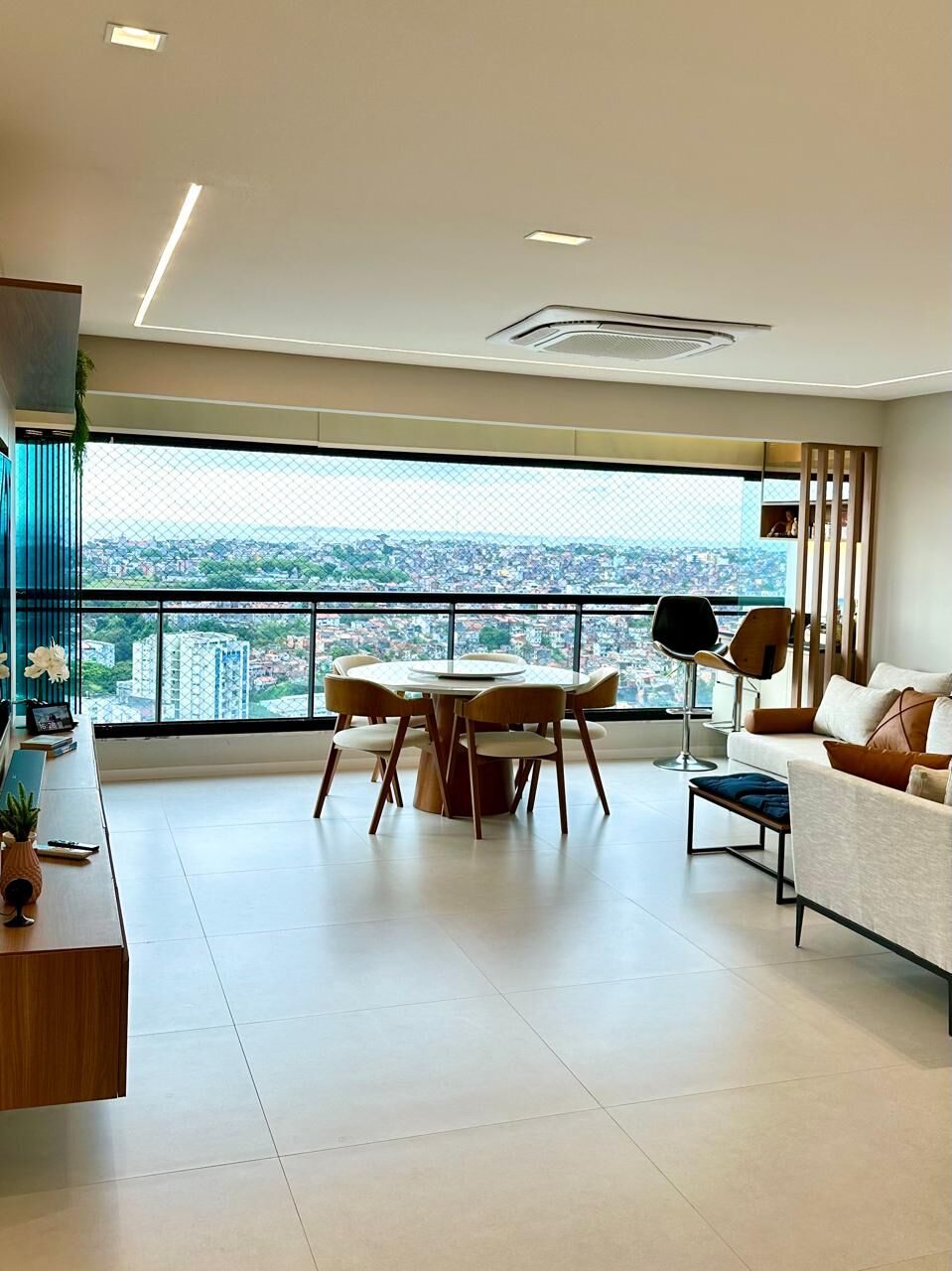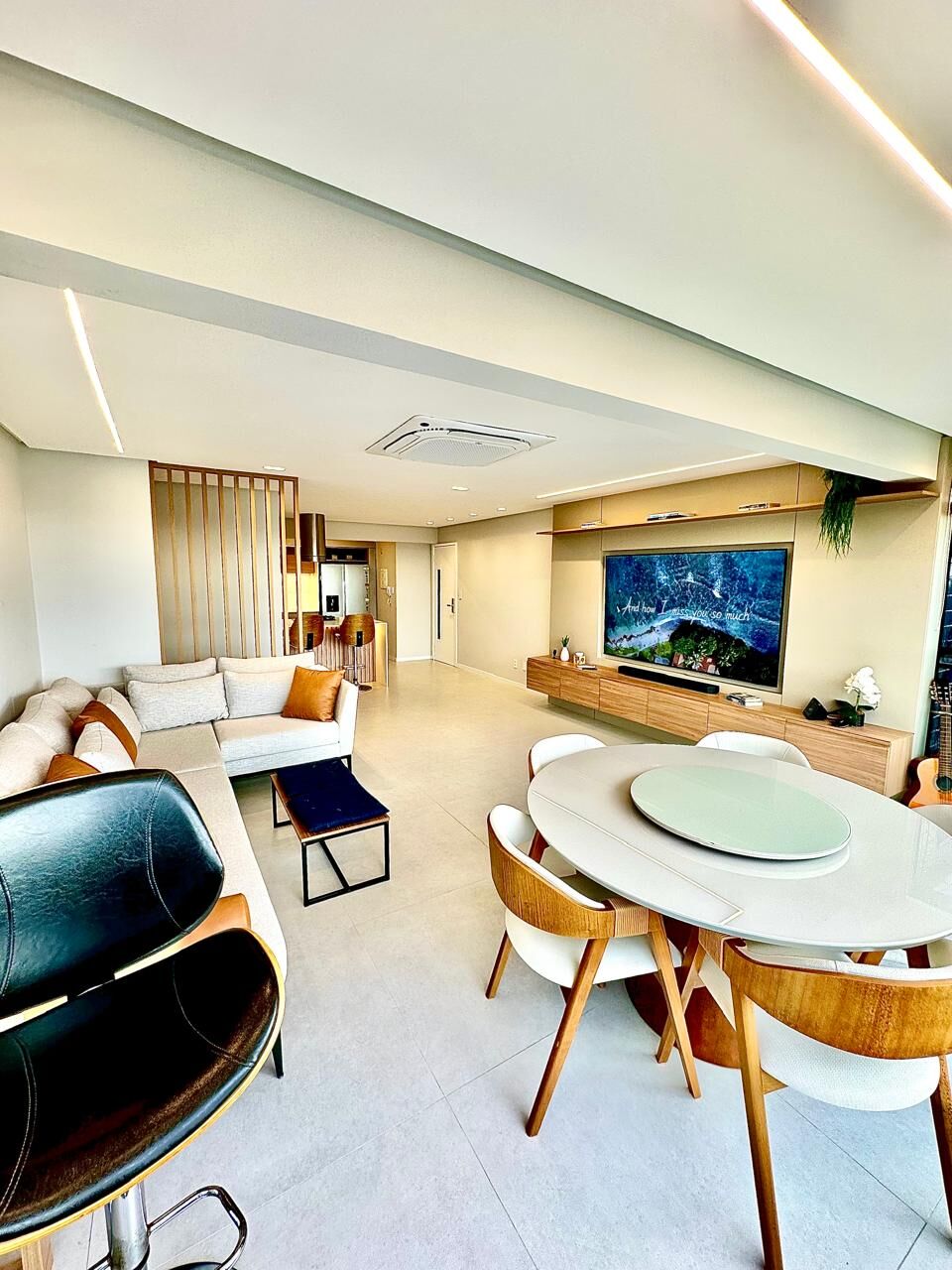 Sala ampla com varanda integrada, marcenaria planejada, instalada há apenas dois meses que harmoniza-se com o teto em rebaixamento de sanca de gesso e projeto de iluminação em LED automatizada, controlada por Alexa. As cortinas elétricas também são automatizadas, garantindo conforto e privacidade ao toque de um comando.